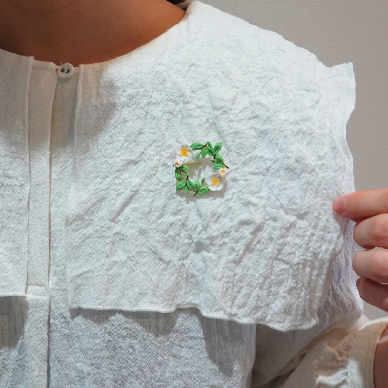 日本茶(チャノキ)の葉と花をモチーフにした、つまみ細工のブローチです。