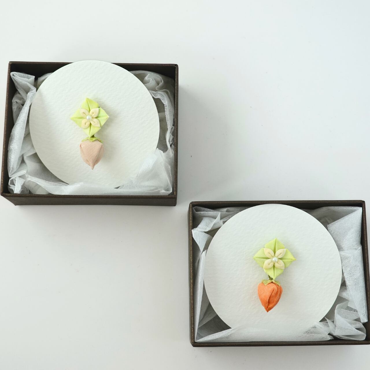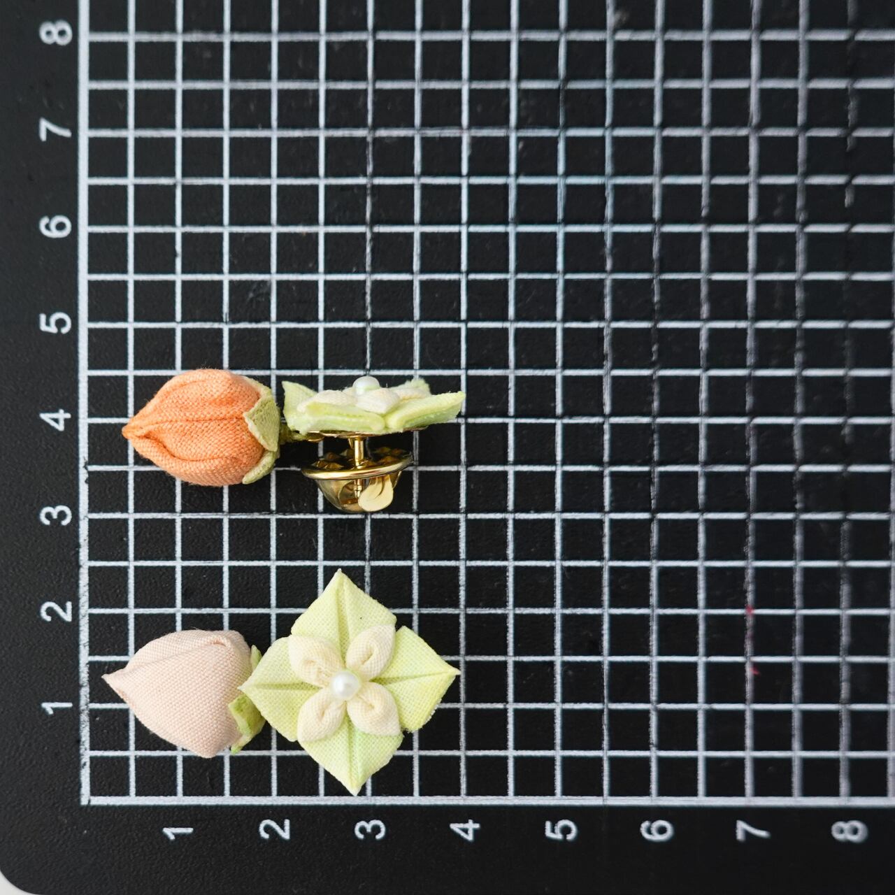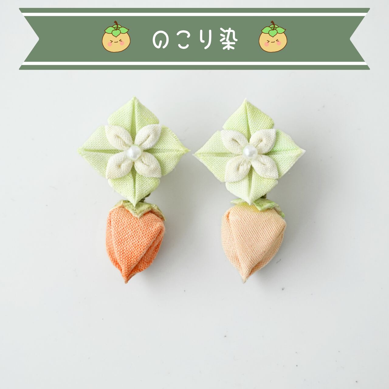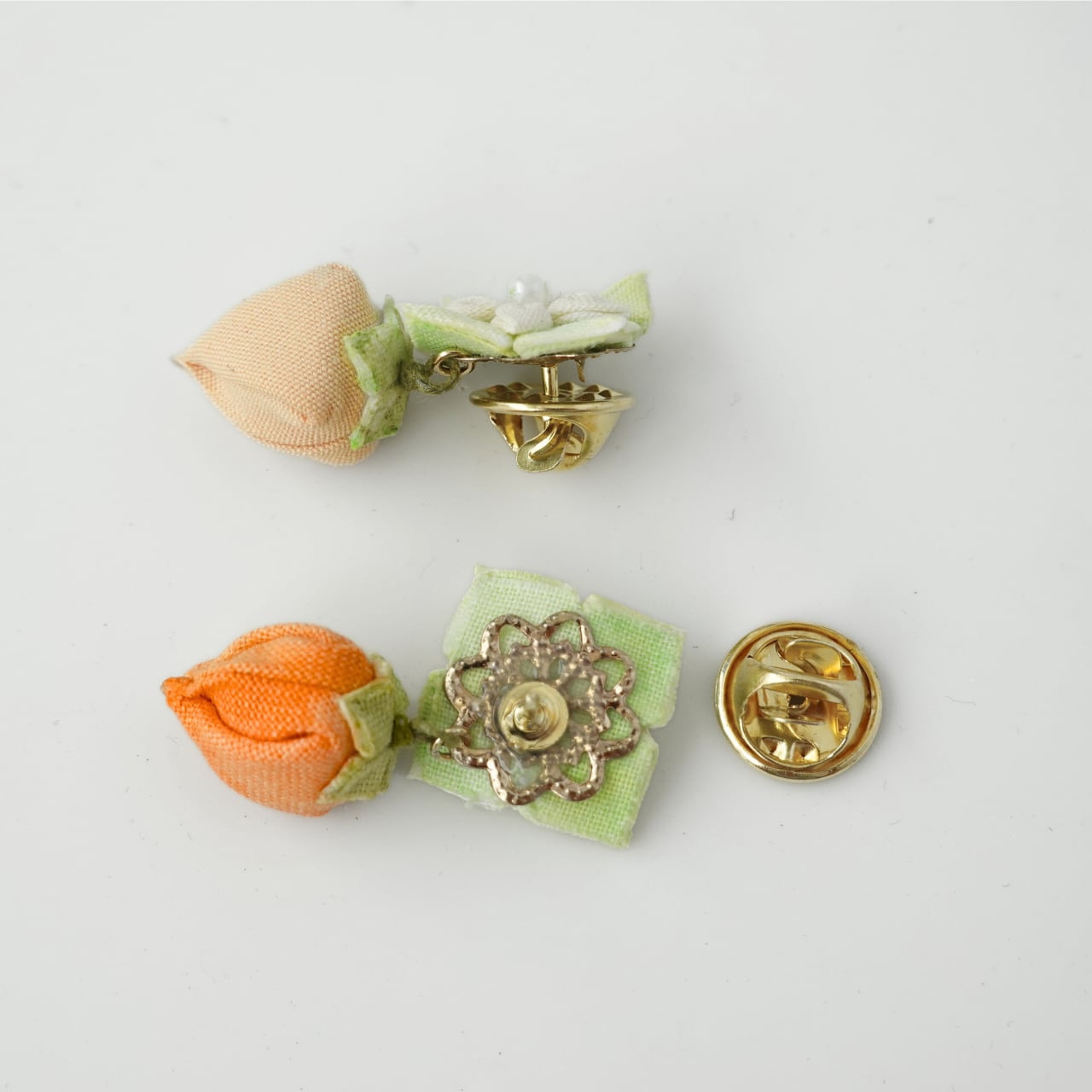 堂上蜂屋柿の花と実をモチーフにした、つまみ細工のピンバッジ(ピンズ)です。自然が生み出すやさしい色の世界を感じていただけるよう、実の部分は下記の2色からお選びいただけます。