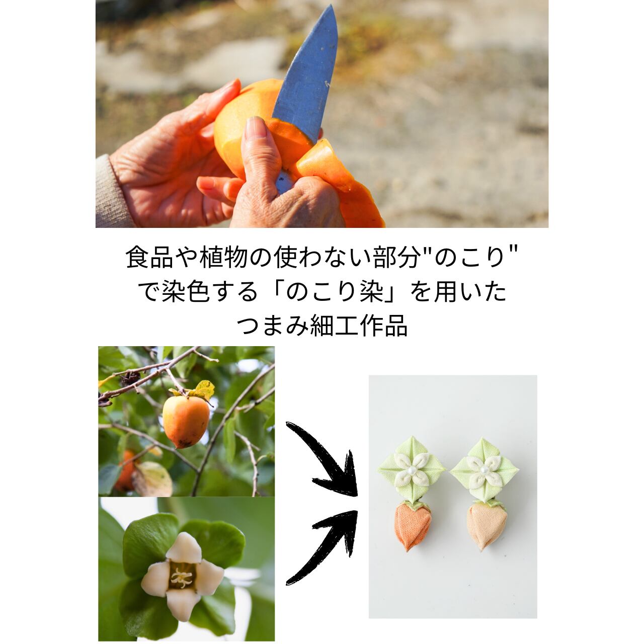 『のこり染』は、食品や植物を加工する際に生じる「残って捨てられてしまう部分(のこり)」を染料として再利用し、布を染め上げるサステナブルな染色方法です。岐阜県美濃加茂市蜂屋町の特産である「堂上蜂屋柿」の皮から染められた〈かき〉の生地を採用し、つまみ細工の技法で柿の実を表現しました。さらに本作品では、残反(裁断や縫製の過程で生まれる生地の余り)を今回活用させていただき、資源の有効利用と環境負荷の軽減を目指しています。