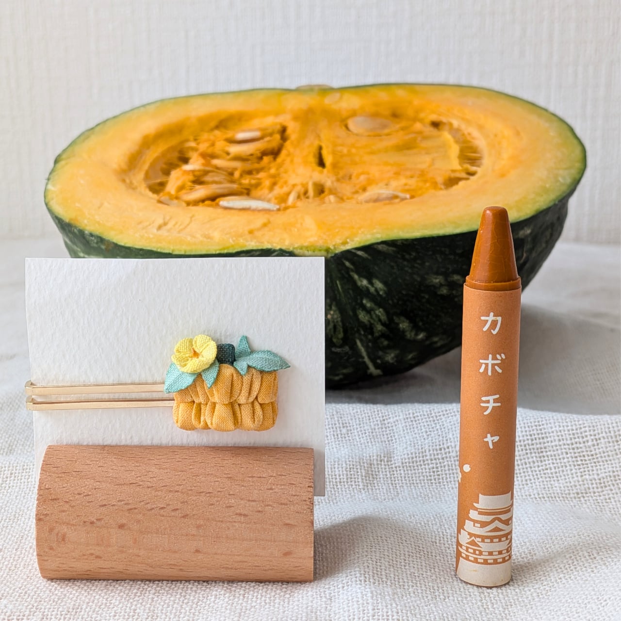 今回の作品は、その「カボチャ色」のクレヨンで白いコットン生地を手作業で色付けをし、つまみ細工として仕立てました。布への発色は鮮やかで安定し、アイロン処理を加えることで色が定着し、にじみの少ない深みのある質感に仕上がっています。カボチャの実はおやさいクレヨンですが、花と葉っぱは水彩色鉛筆で植物の繊細さを表現しました。