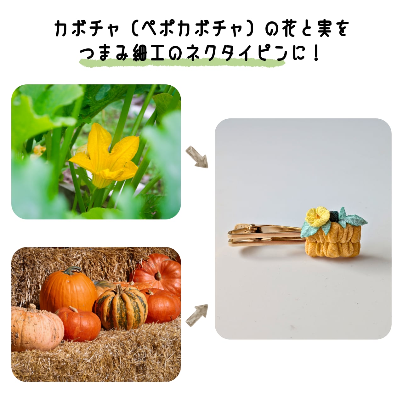 カボチャ(ペポカボチャ)の花・葉っぱ・実をモチーフにした、つまみ細工のネクタイピン(タイクリップ)です。