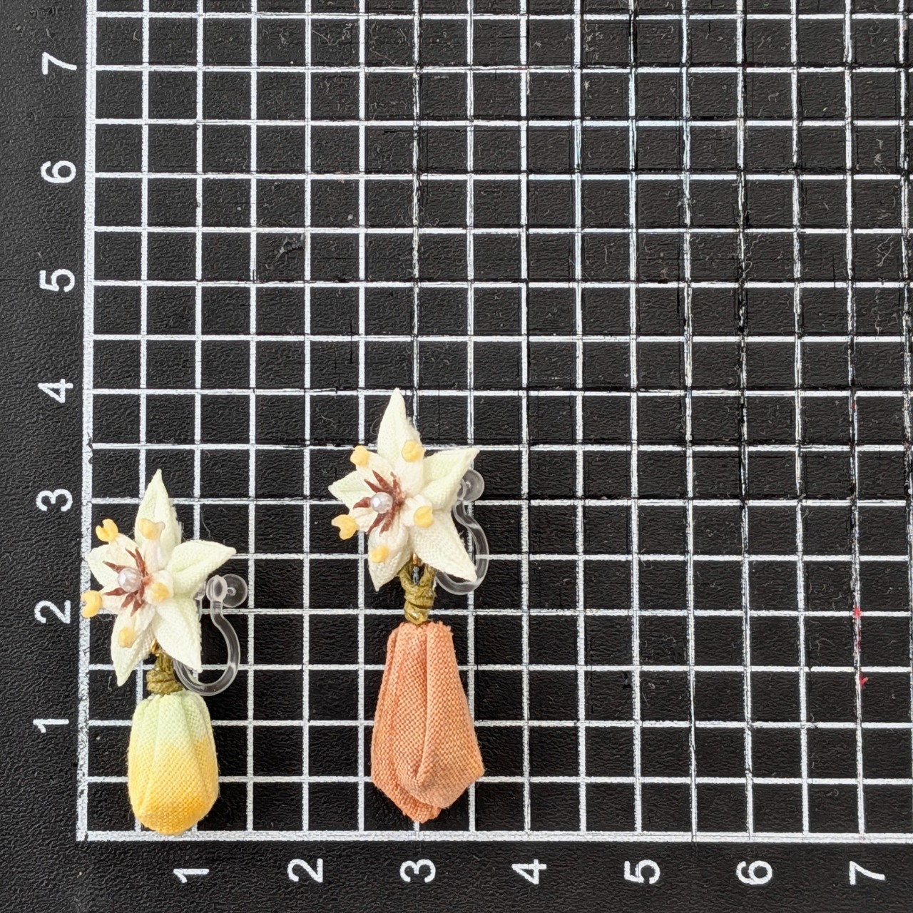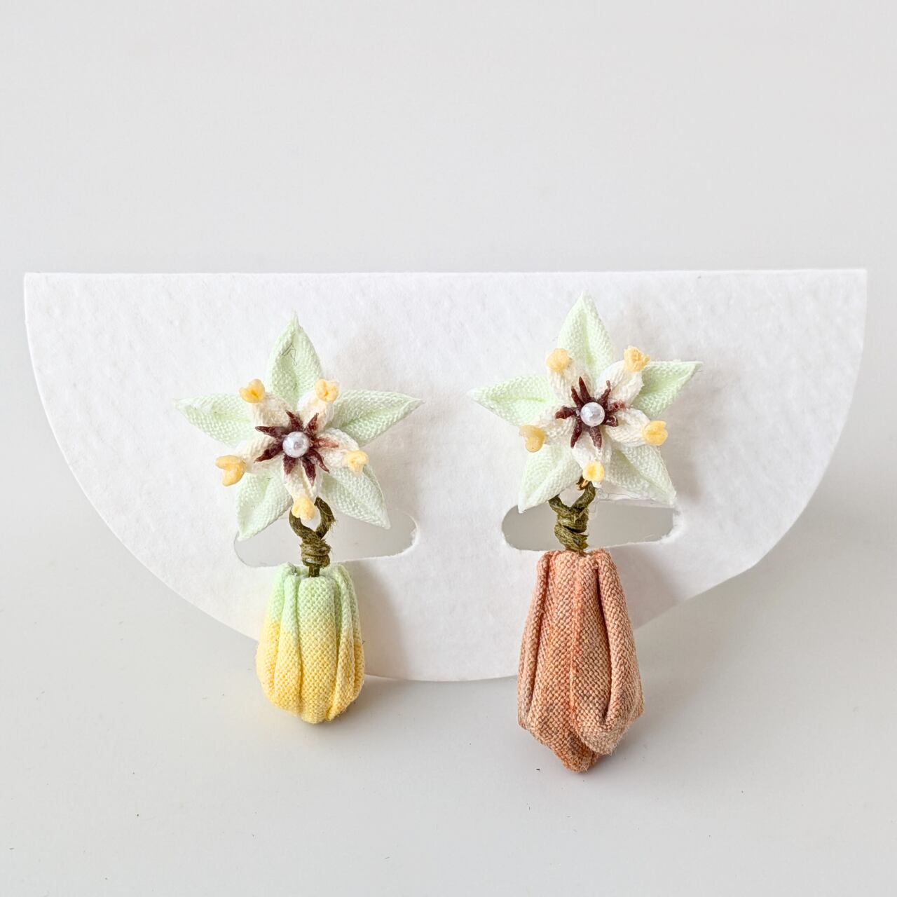 カカオの花・実(カカオポッド)をモチーフにした、つまみ細工の耳飾りです。