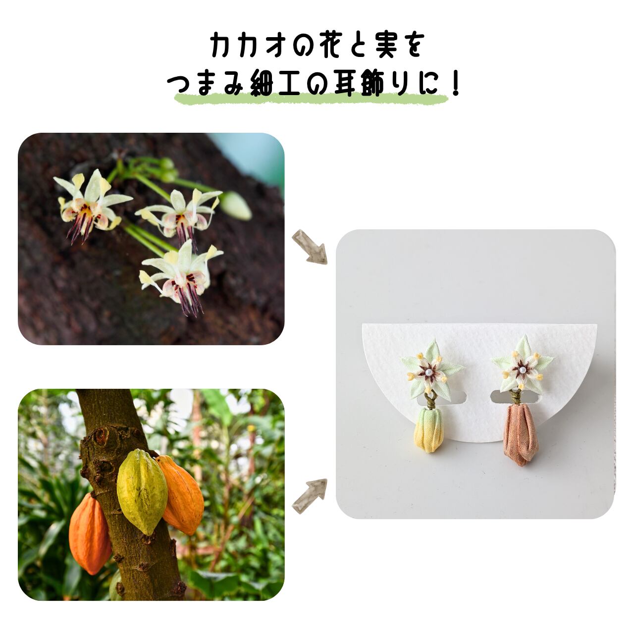 花と実(カカオポッド)をひとつの耳飾りに。