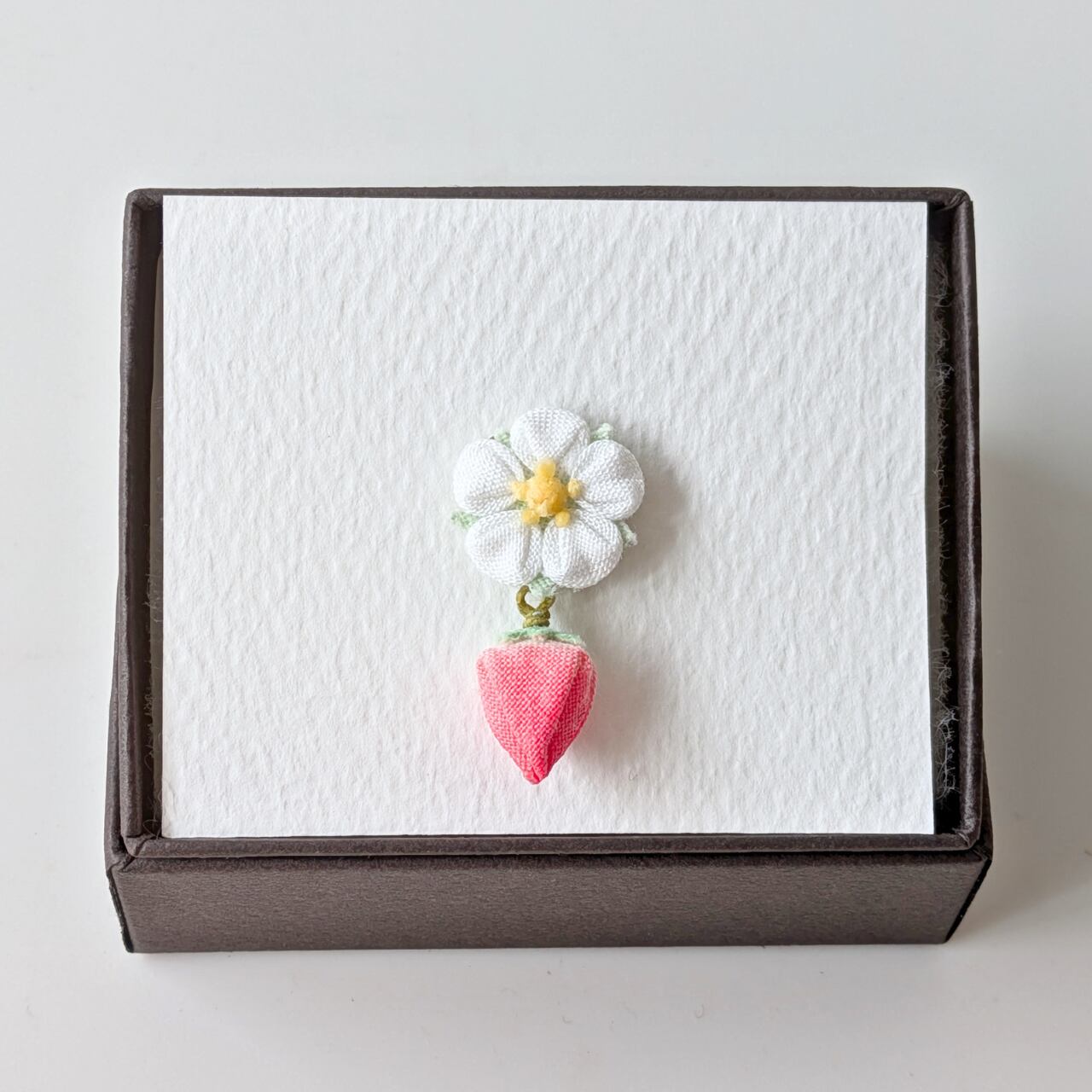 イチゴ(美濃娘)の花・実(集合果)をモチーフにした、つまみ細工のピンバッジです。